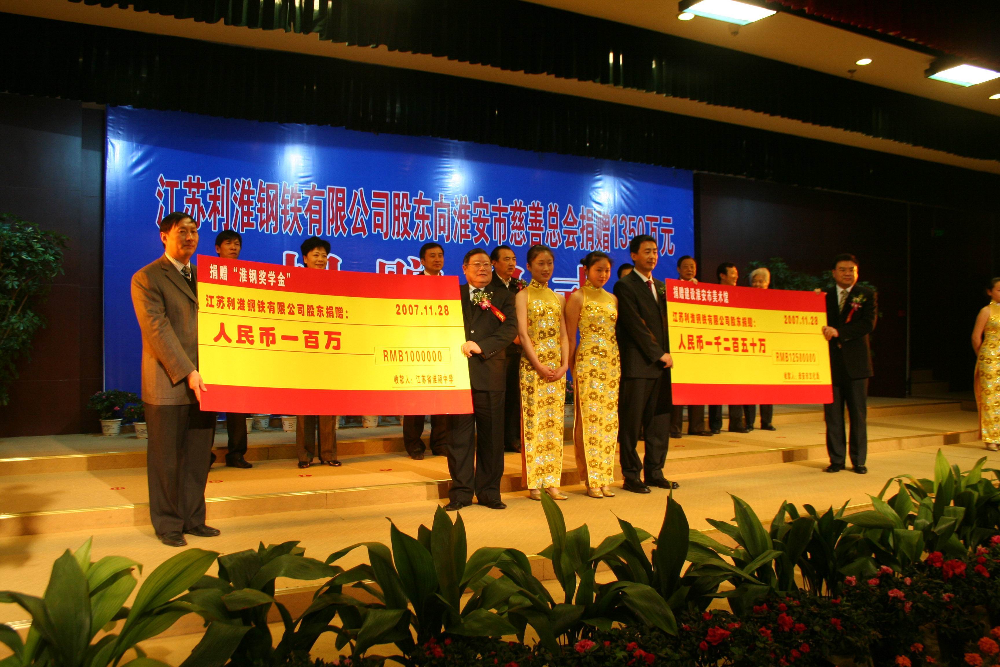 2002年,沙钢淮钢特钢公司在淮阴区五里小学成立“淮钢春蕾班”,每年资助1.5万元;2007年向淮安市慈善总会捐赠1350万元,其中1250万元由市慈善总会定向捐赠淮安市利淮“美术馆”,另100万元赠给江苏省淮阴中学作为“淮钢奖学金”;向淮安团市委希望办捐款以及向淮安盱眙穆店 乡中心小学捐赠“爱心礼盒”等捐款累计112万元。